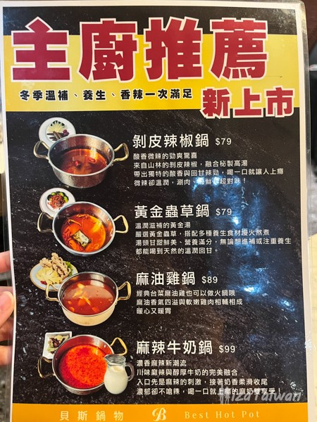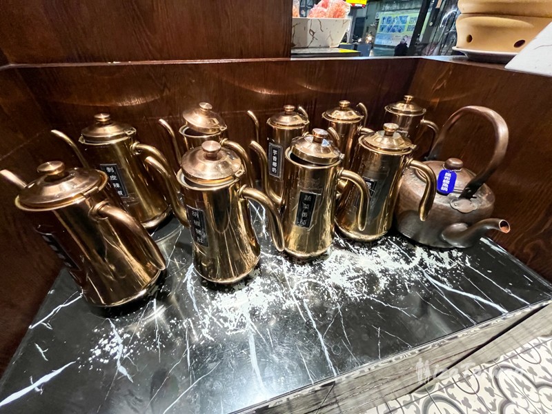湯底選擇多元,目前基本約有8款湯底,昆布鰹魚鍋為免加價基本湯底,其餘如重慶麻辣鍋、胡椒豬肚鍋等需加價39–99元不等,還有新推出的剝皮辣椒鍋、黃金蟲草鍋、麻油雞鍋、麻辣牛奶鍋,讓你冬季溫補、養生、香辣一次滿足。