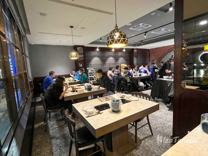 店內空間寬敞,深色木質牆面搭配紅磚拱形結構,結合現代與復古元素,座位多為四人桌且桌距寬,氣氛溫馨不壓迫,非常適合家庭與朋友聚餐。