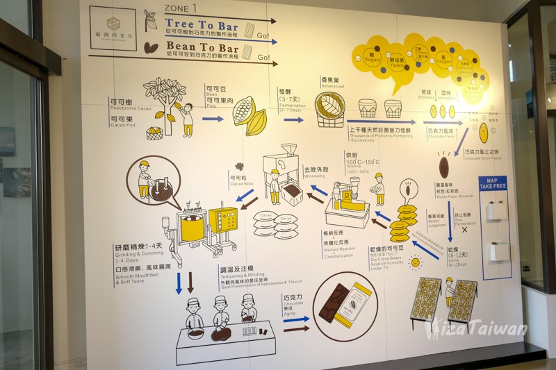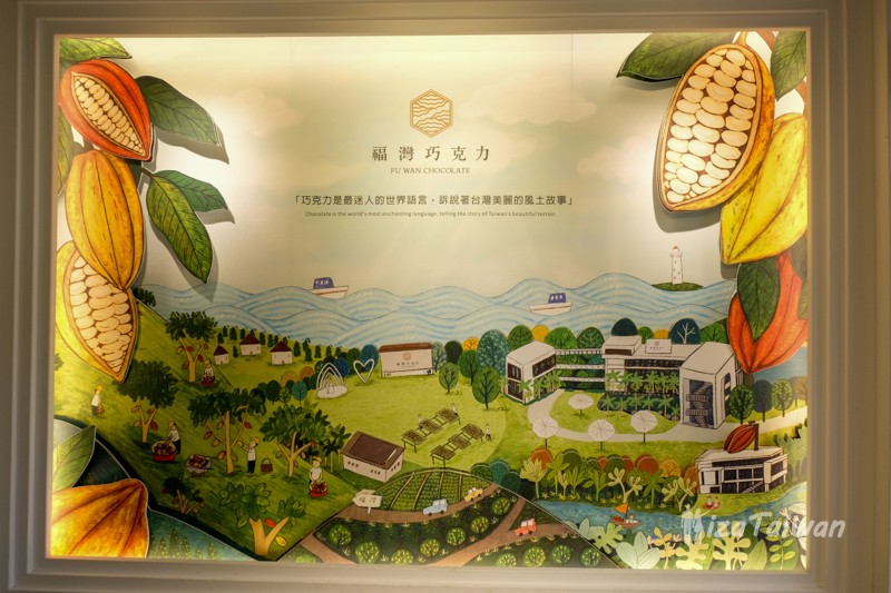 福灣巧克力工廠不僅是一個生產巧克力的場所,更是一個充滿教育意義的巧克力莊園。在這裡可以親眼目睹可可豆變成巧克力的過程,了解巧克力的製作工藝。從可可樹田間管理、採果、集中發酵(產生獨特風味)、曬乾烘焙、粗碎研磨萃取可可脂、調溫成形,全程耗時1個月以上,低溫熟成更達半年,使用獨創FIDARGS流程,80%以上原料來自台灣屏東,堅持天然可可脂無氫化油。工廠內的可可園、發酵場、乾燥場、烘焙室、研磨室、調溫室等區域,每一個環節都經過精心的設計和嚴格的把關。