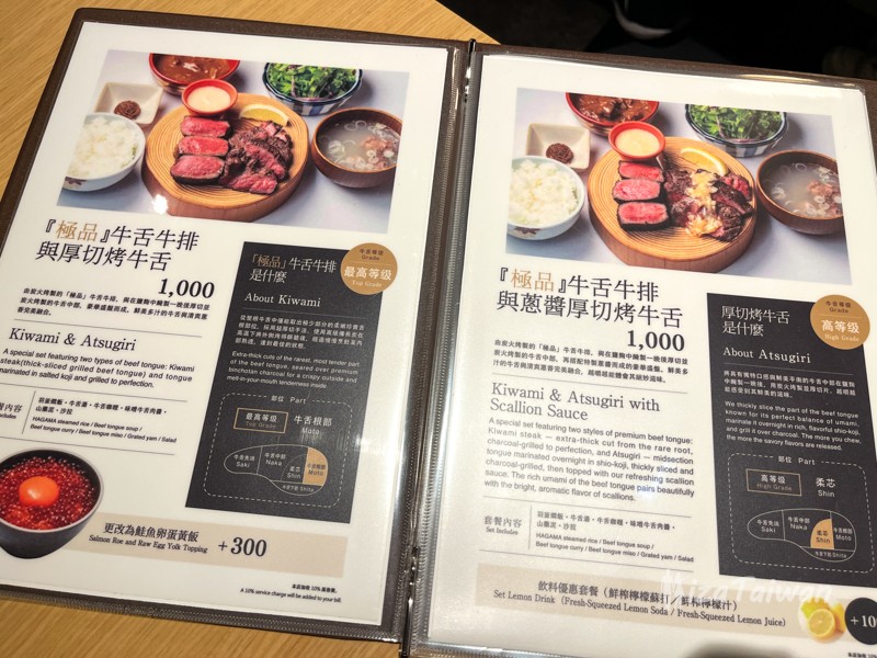 台北店本店也延續日本店型態,以「厚切牛舌定食/套餐」為主軸,提供多種不同份量與組合,通常會附上由特製羽釜炊煮的特A級白飯、牛舌湯、牛舌咖哩、生菜沙拉,醬料部分則有味噌醬、山藥泥、檸檬等,讓顧客享受豐富層次的口感和味覺。