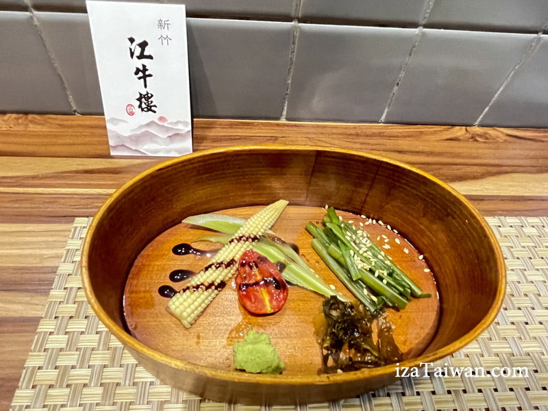 冷菜盒裡有醃漬過的空心菜、清爽的芹菜及玉米筍,還有半顆小番茄及些許辣酸菜,另外還有搭配牛肉食用的生芥末。