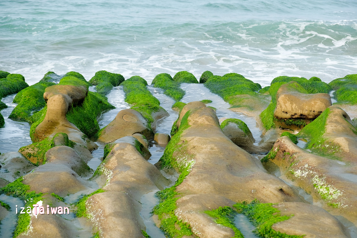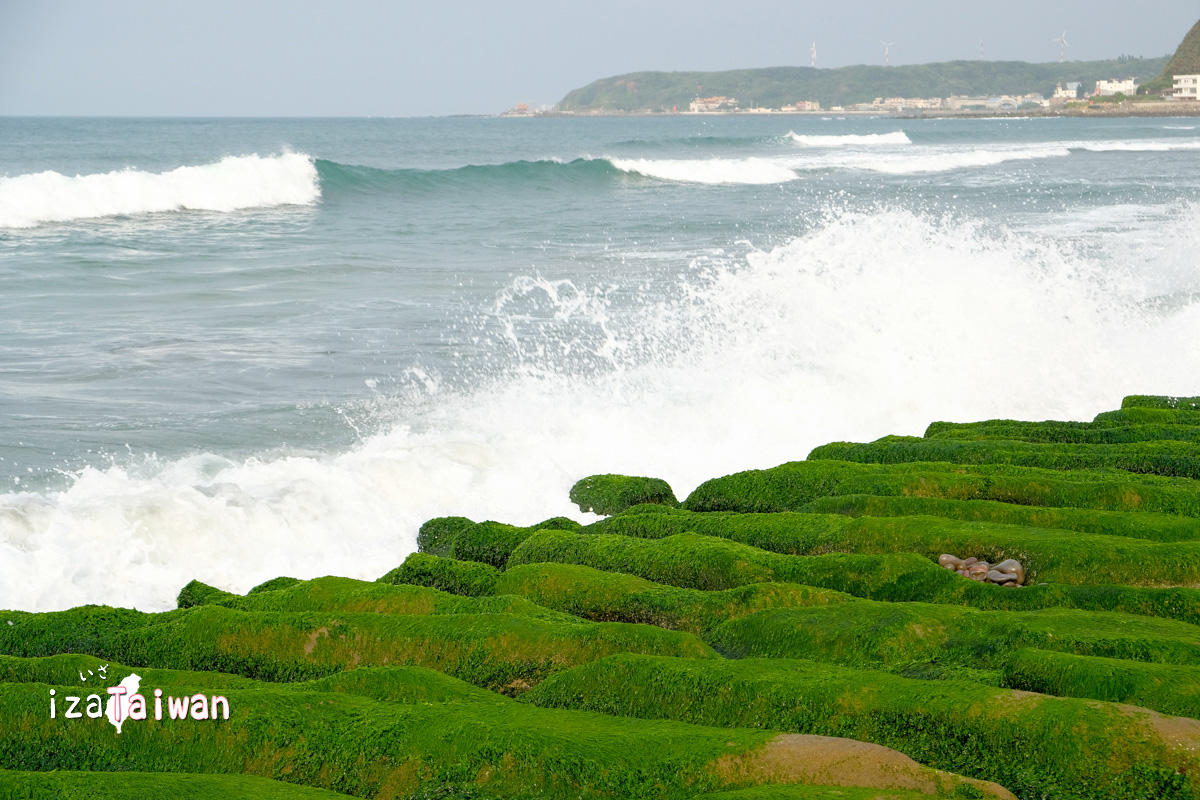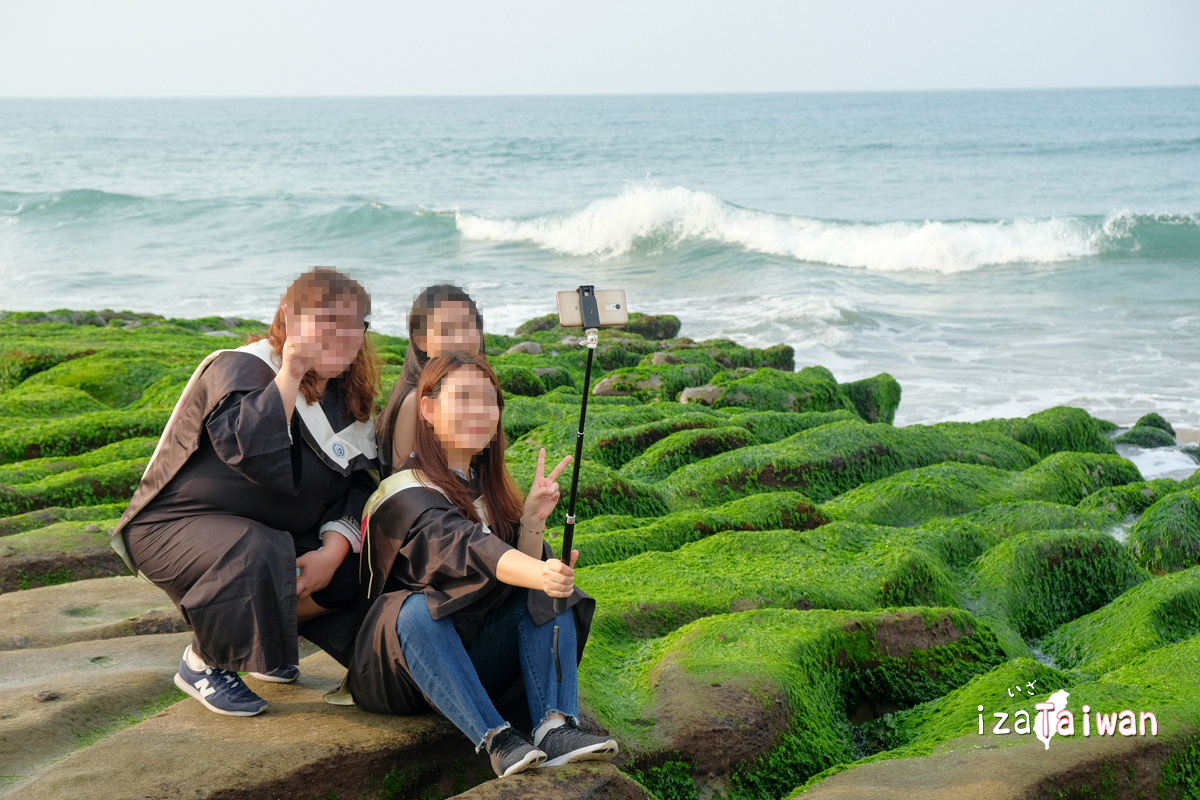 這要歸功於大屯火山爆發,「老梅石槽」是火山礁岩受海水經年累月侵蝕的結果。每到春天,溝槽上長滿石蓴、扁石髮等海藻。鮮豔的綠藻與蔚藍大海相互輝映,奇石彷彿披上綠色毛地毯,加上白色浪花在石溝間翻滾,吸引無數攝影愛好者前來,也是拍攝畢業照和婚紗照的熱門地點。不同的拍攝角度,能捕捉到不同程度的「綠」。