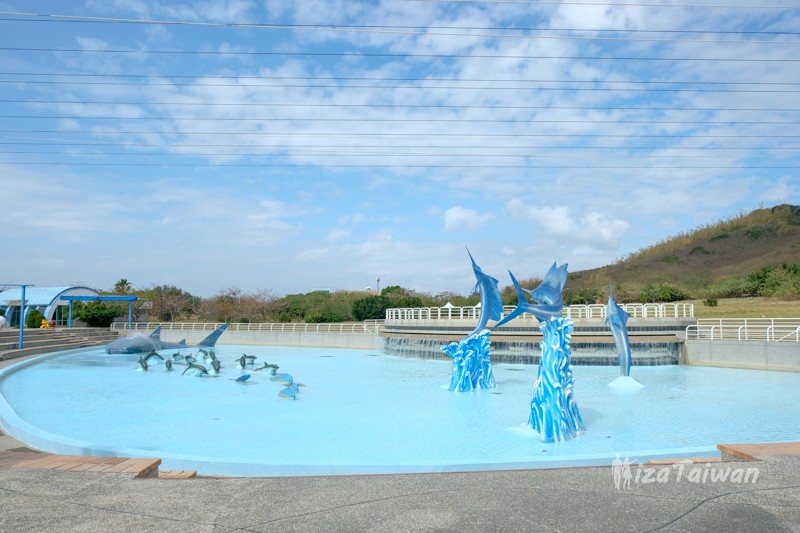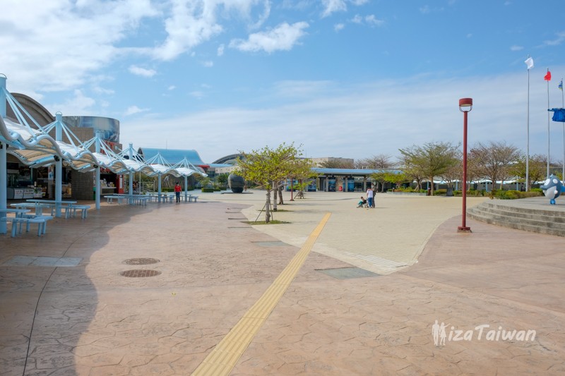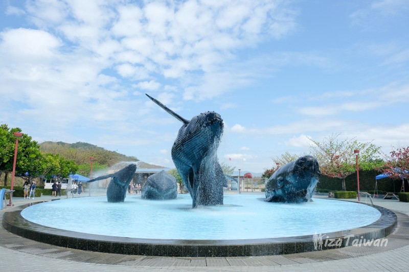 入口迎賓廣場設太平洋親水廣場及鯨魚親水廣場,使用等比例鯨魚、海豚模型再現海洋躍動,遊客可在此戲水休憩;廣場另有超大型琉璃蛋型雕塑「愛與新生」,象徵台灣海洋新生力量。而最具標誌性的鯨典館(太陽能光電經典建築)以生動鯨魚造型為外觀,從遠處眺望宛如巨鯨躍出海面,外覆BIPV太陽能板,提供100瓩發電量,為全國最大鯨魚形綠建築,分上下兩層供水上活動與生態探索。