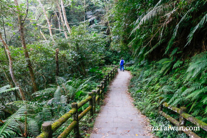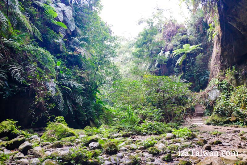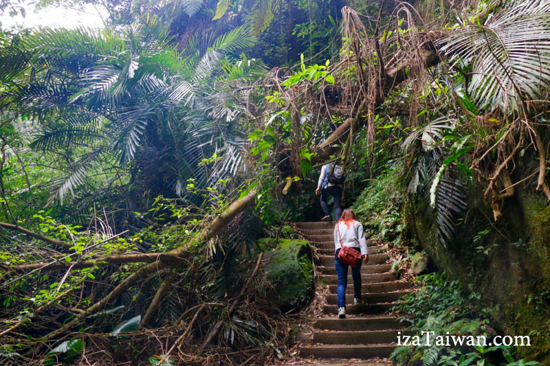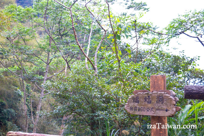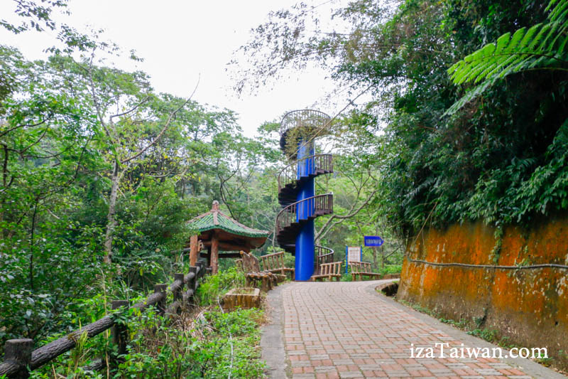 走到蝙蝠洞大約20~30分鐘的時間,路口步道一直走~看到藍色的旋轉樓梯之後,就往涼亭旁邊的小路繼續往裡面走。