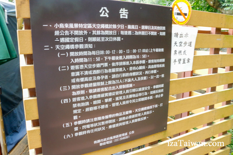 當然入口處也是有個要注意的公告。還有先前在天空步道使用下來的票根,在這邊入口處會有工作人員核"剪",也就是會在票根上釘一個洞,代表在天空繩橋已使用過嘍!等於一開始50元的票券,可參觀天空步道+天空繩橋。