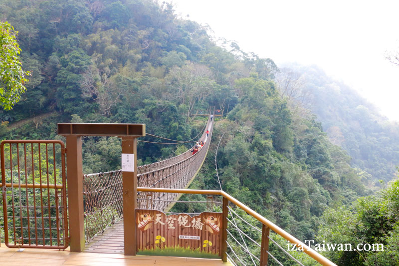 橋面上寬度約一百公分,全長七十公尺,繩橋架在離地約五十公尺的大利幹溪谷間,雖然在建造之初就已經將結構設計強度規劃為可承載120噸重量,並在橋的兩側特別安裝了抗風主索,以避免強風讓繩索過於蛇行搖晃,但相對於天空步道的主索是在上方,繩橋的主索則是安裝在步道的下方,再加上前後遊客步伐的共震效益,讓吊橋一路走來感覺格外搖晃,特殊的高空挑戰真的能充份感受到視覺的刺激及感官上的震憾。